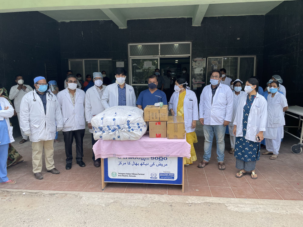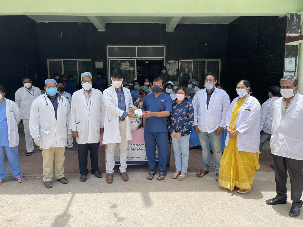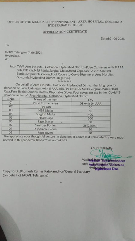 Donated 03 pulseoximeters,100 PPE Kits,100 N95 masks, 100 Face shields,550 surgical masks,550 head caps and 100 gloves,50 sanitizer bottl to COVID19 pts in GOLKONDA Govt Hosp,hyd on 21-6-21
