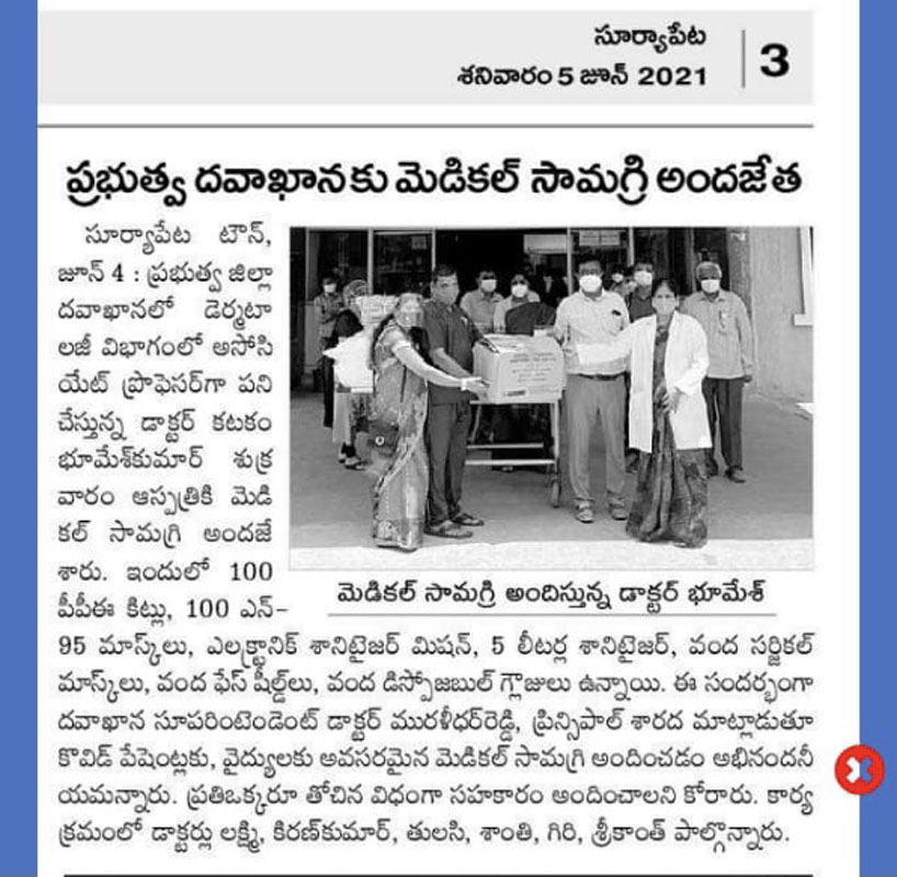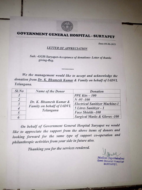 Donated 100 PPE Kits,100 N 95 masks, 100 Face shields,100 surgical masks and 100 gloves to COVID19 pts in GGH SRPT on 29-5-20(Donor Dr.Bhumesh)
